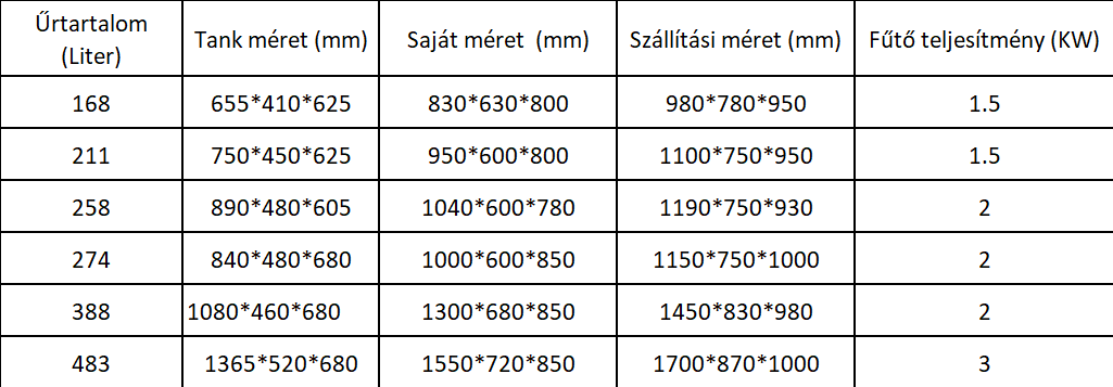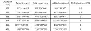 | Űrtartalom (L) | 168, 211, 258, 274, 388, 483 |