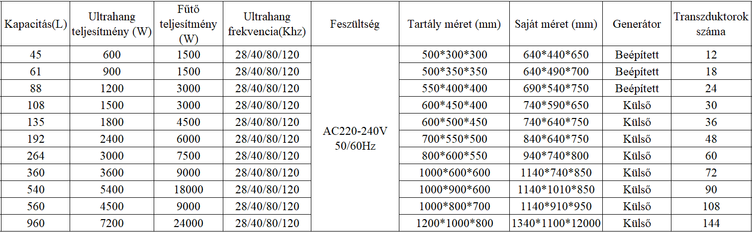 | Kapacitás (L) | Ultrahang teljesítmény (W) | Fütő teljesítmény (W) | Ultrahang frekvencia(kHz) | Tartály méret(mm) | Generátor | Transzduktorok száma |